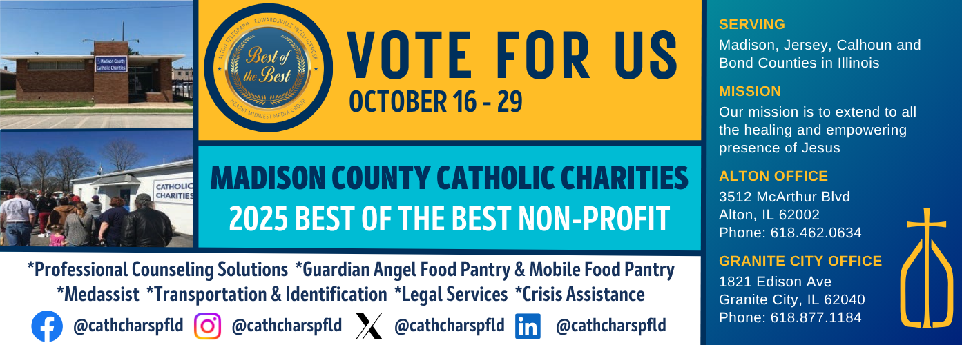Click Here to Vote, scroll down to the non-profit category, & Vote Madison County Catholic Charities as Best of the Best local non-profit in your community.